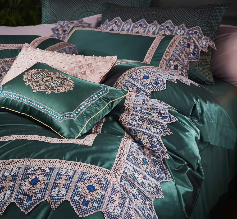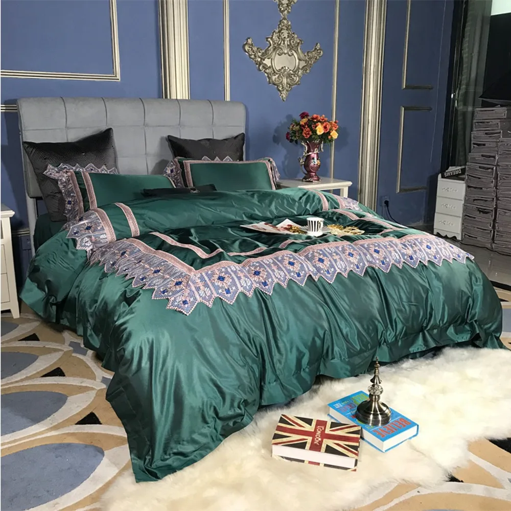 Special Offer Noble 100 S Tencel Algodão Egípcio Conjuntos De Cama De Seda Rainha Rei Luxo Borda Do Laço Real Capa De Edredão Set Folha De Cama Europa Verde Discount [NEW!!] Today!