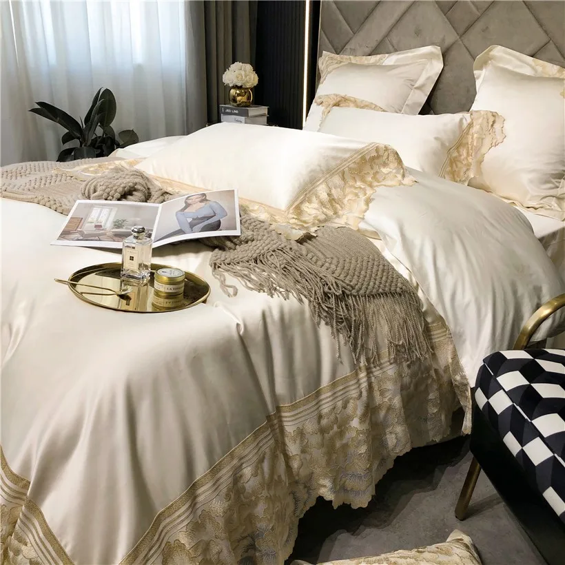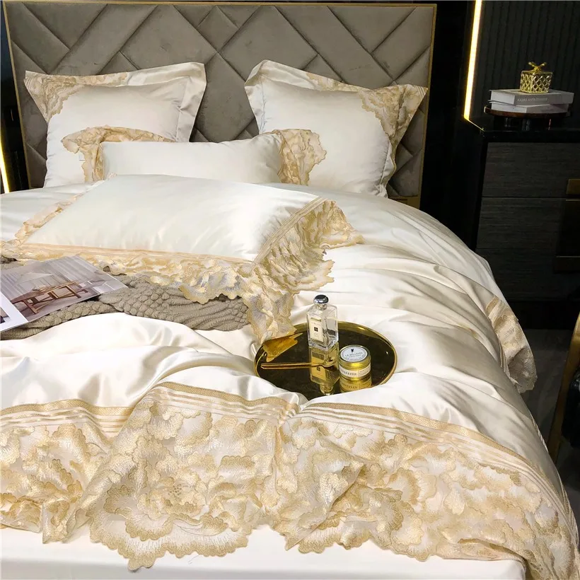 Special Offer Chique Flores De Renda Larga Capa Edredão Cetim + Algodão Egípcio Bege Rosa Cama Consolador Capa Folha Ultra Macio Seda 4/7pcs Discount (25%OFF) Today!